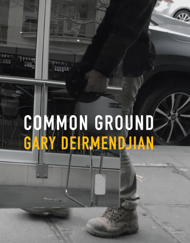 title: COMMON GROUND author: GARY DEIRMENDJIAN ISBN: 978 0 6451319 4 9 format: limp bound cover with flaps pages: 390 pp; 105gsm images: 302 [including 61 QR links to videos & posts with multiple elements] dimensions: 180 x 148mm publisher: BANDICOOT PUBLISHING published/released in Australia: May 2025 editors: KON GOURIOTIS & IMOGEN CHARGE cover & book design: BRENDAN O'DONNELL sub editors: SHARON LAPKIN & GABRIELLE GWYTHER printed: ASIA PACIFIC OFFSET, China [Hong Kong]